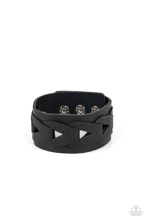 Featuring airy triangular cutouts, black leather links interlock across the center of a distressed black leather band for a rustic flair. Features an adjustable snap closure.