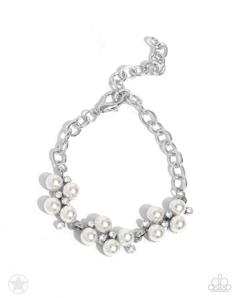 Cascading from a classic silver chain, clusters of shimmery white pearls and sparkling dainty, white rhinestones connect along the wrist, creating a vintage, timeless statement. Features an adjustable clasp closure.