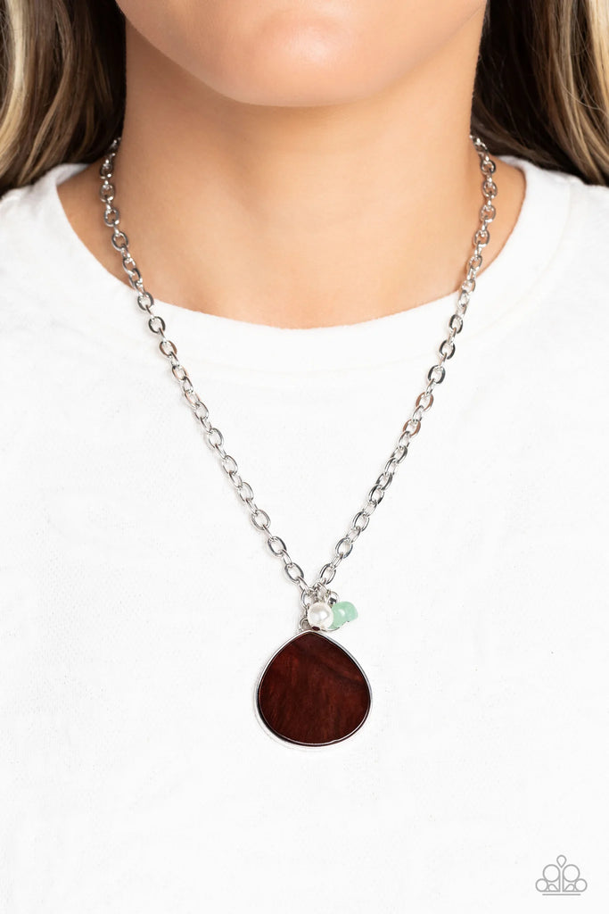 Infused along a shiny silver chain, a baroque white pearl, a dainty shiny silver disc hammered with texture, and a jade stone rest for an elegant and earthy combo. Hanging at the bottom of the shiny silver chain, an oversized brown shell teardrop, wrapped in a shiny silver frame, finishes off the artisanal design. Features an adjustable clasp closure. As the stone elements in this piece are natural, some color variation is normal.