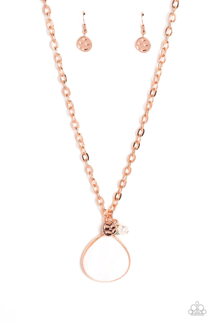 Infused along a shiny copper chain, a baroque white pearl, a dainty shiny copper disc hammered with texture, and a jade stone rest for an elegant and earthy combo. Hanging at the bottom of the shiny copper chain, an oversized white shell teardrop, wrapped in a shiny copper frame, finishes off the artisanal design. Features an adjustable clasp closure. As the stone elements in this piece are natural, some color variation is normal.