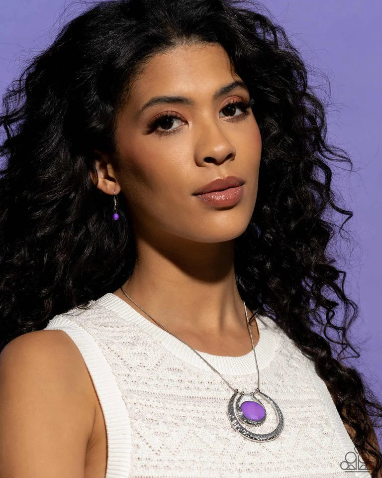 Encased in a sleek silver frame, an oval lavender shell rests horizontally at the bottom of a curved silver hammered bar, creating a half moon frame at the bottom of a sleek silver snake chain. A larger, curved, half moon frame with a hammered sheen layers below the shell-lined smaller frame for additional eye-catching detail.