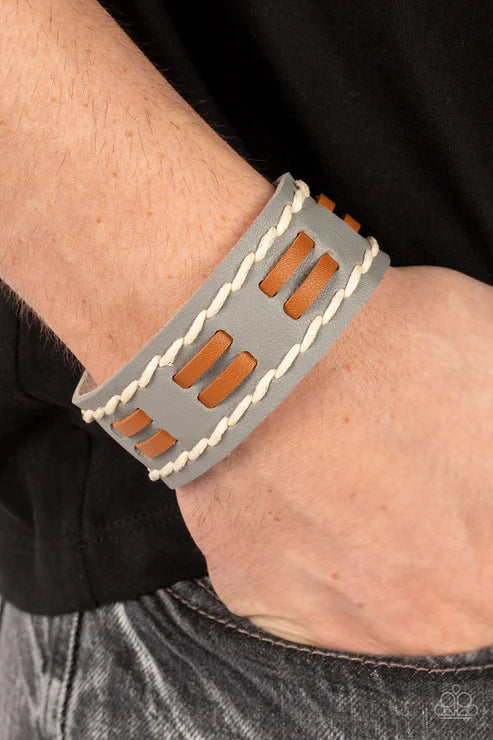 Flanked with two stitched rows, two rows of brown leather laces are threaded through the center of a gray leather band for a rustic pop of color around the wrist. Features an adjustable snap closure.