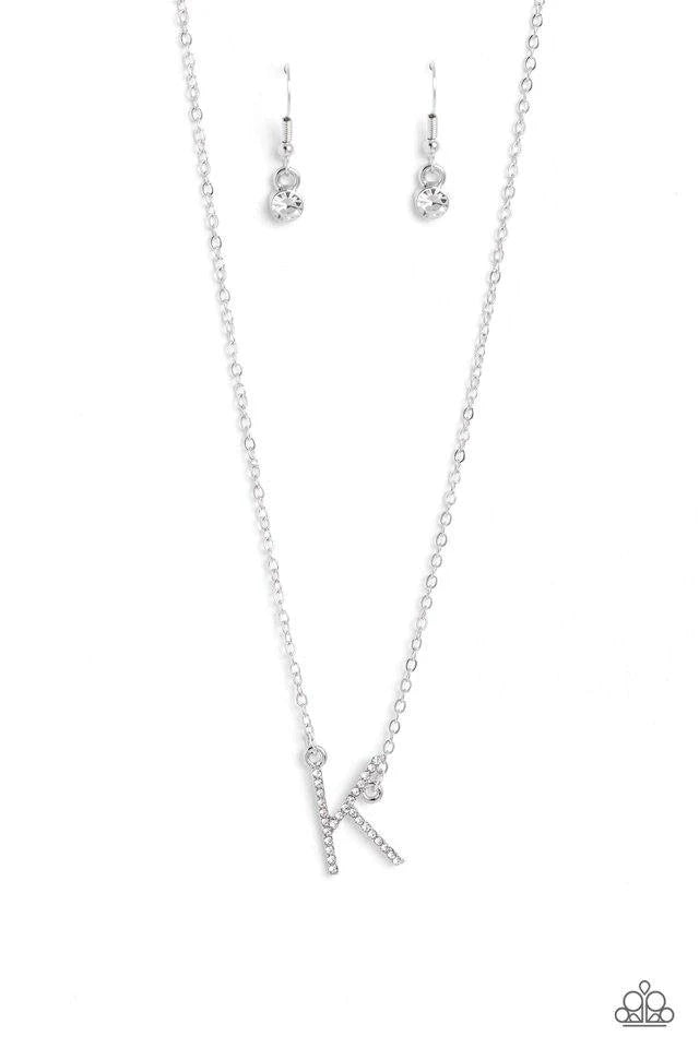 Embossed with dainty white rhinestones, a silver letter "K" hovers below the collar from a dainty silver chain, for a sentimentally simple design. Features an adjustable clasp closure.