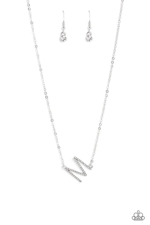 Embossed with dainty white rhinestones, a silver letter "M" hovers below the collar from a dainty silver chain, for a sentimentally simple design. Features an adjustable clasp closure.