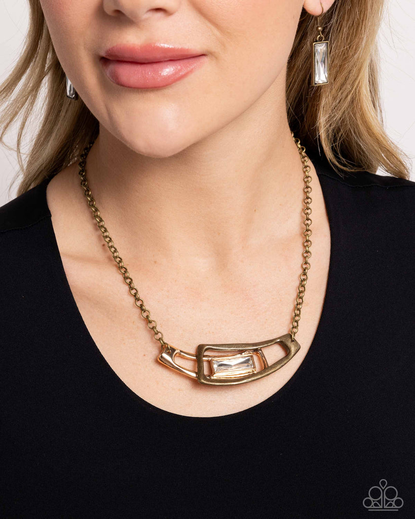 Featuring a classic brass chain, an oversized abstract brass frame interlocks with a smaller gold abstract frame that features an elongated emerald-cut white gem at its center for an adorable artisan-inspired display. Features an adjustable clasp closure.