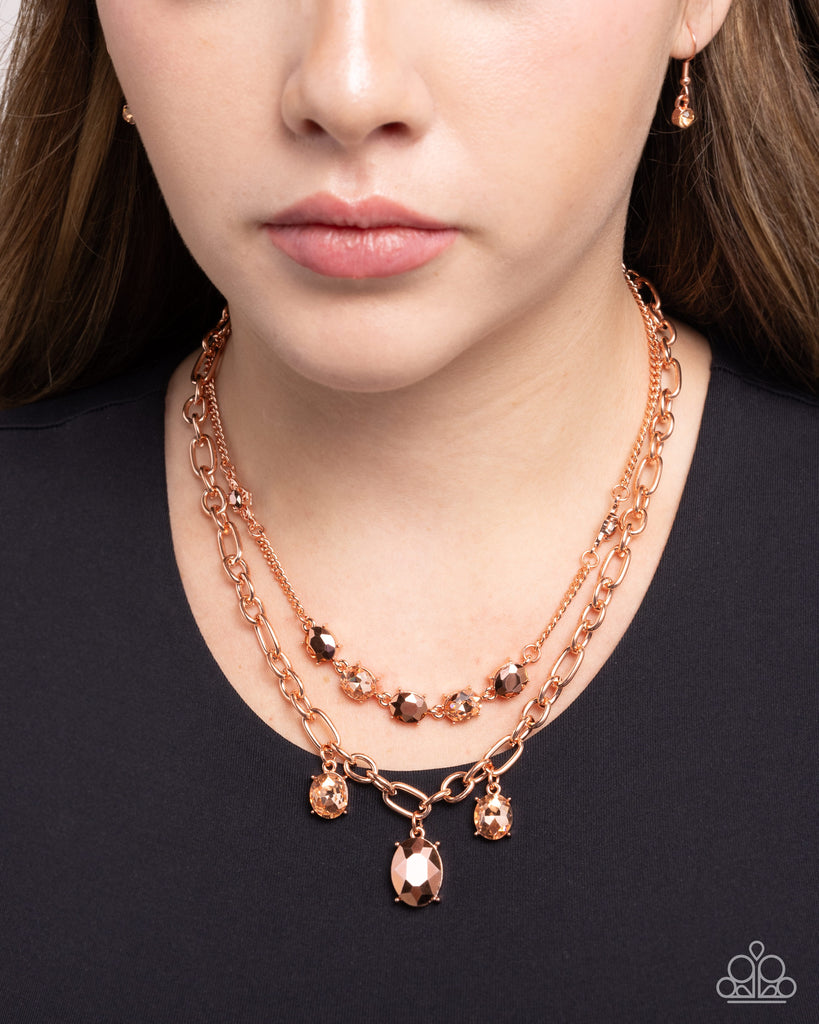 Connecting to a classic shiny copper chain, a mismatched duo of dainty and abstract paperclip shiny copper chains coalesce and layer below the neckline. Infused along the uppermost chain, dainty copper aurum gems lead the eye to pronged copper aurum gems that alternate with peachy gems along the center of the display for a splash of glamorous color. Pressed in shiny copper fittings, a trio of round peach gems and a copper aurum oval sway for a charismatic finish. Features an adjustable clasp closure.