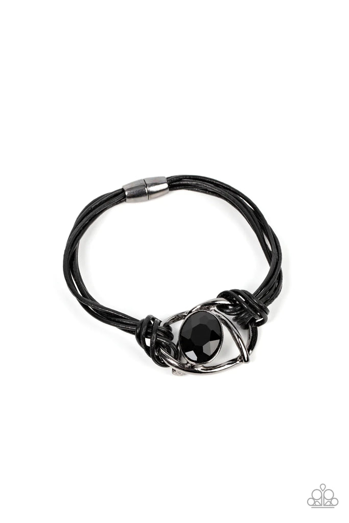 Shiny gunmetal bars abstractly twist around an oversized oval black gem, resulting in a mesmerizing centerpiece that is knotted in place with layers of black leather cording. Features a magnetic closure.