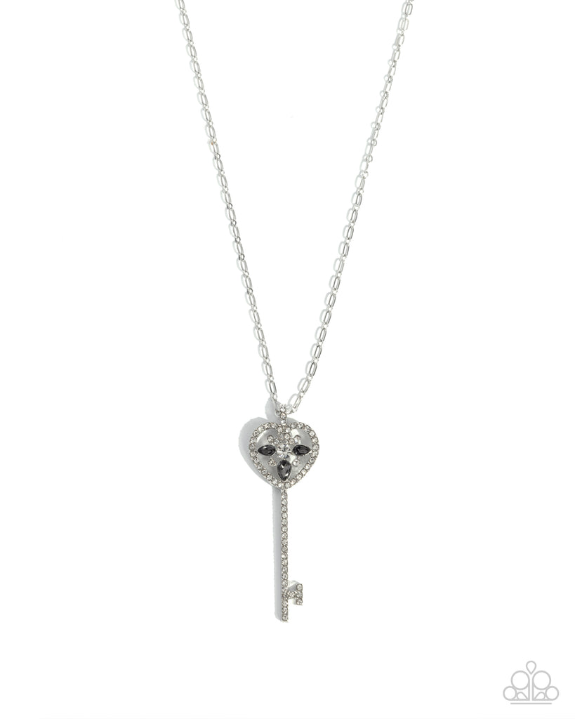 Dusted in glittery white rhinestones, an elongated silver key glides along a dainty silver paperclip chain for a playful pendant. Featured in the center of the curly key, additional white rhinestones in varying sizes and a trio of smoky teardrops glisten for a shimmery finish. Features an adjustable clasp closure.