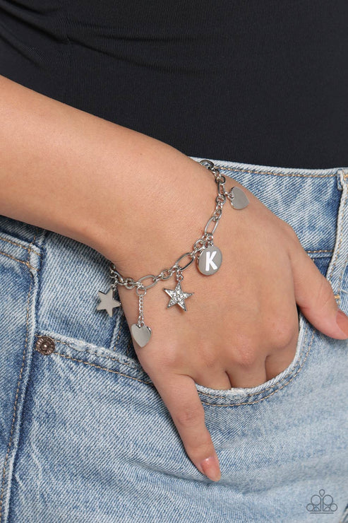 A strand of silver chain is decorated with sentimental charms, including a white rhinestone-encrusted and sleek silver star, a hammered and sleek silver heart, and a white-painted "K" silver pendant for a charismatic display around the wrist. Features an adjustable clasp closure.