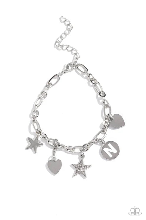 A strand of silver chain is decorated with sentimental charms, including a white rhinestone-encrusted and sleek silver star, a hammered and sleek silver heart, and a white-painted "N" silver pendant for a charismatic display around the wrist. Features an adjustable clasp closure.