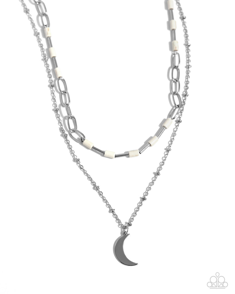 Infused along a silver paperclip strand, white and silver cylindrical beads haphazardly gleam along the neckline. A dainty silver chain with a silver crescent moon charm layers below the beaded strand for an all-natural finish. Features an adjustable clasp closure. As the stone elements in this piece are natural, some color variation is normal.