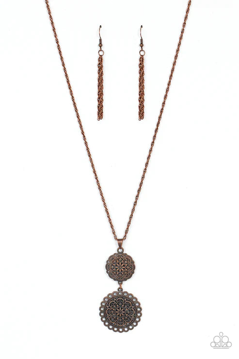 Filled with floral filigree, a scalloped copper frame links with a matching frame scalloped in an airy dotted trim, creating a whimsically stacked pendant at the bottom of a lengthened copper chain. Features an adjustable clasp closure.