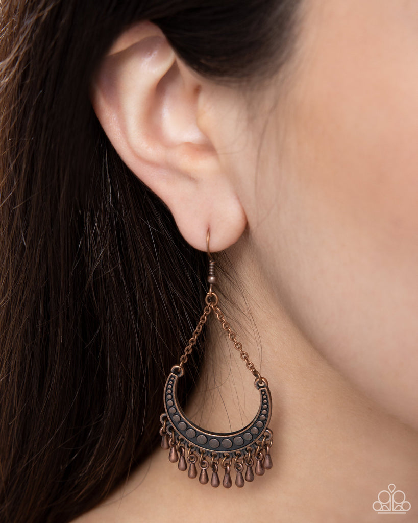 Dainty copper teardrop beads swing from the bottom of a half moon copper frame embossed in flattened copper studs, creating an enchanting fringe at the bottom of two copper chains. Earring attaches to a standard fishhook fitting.