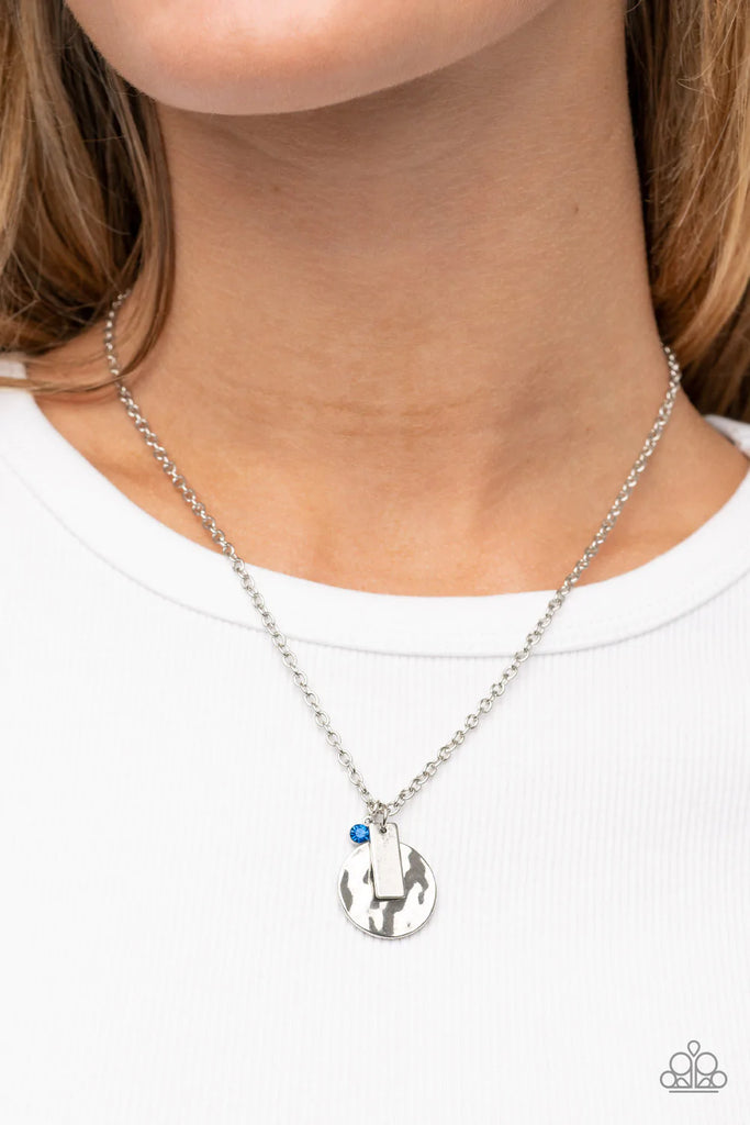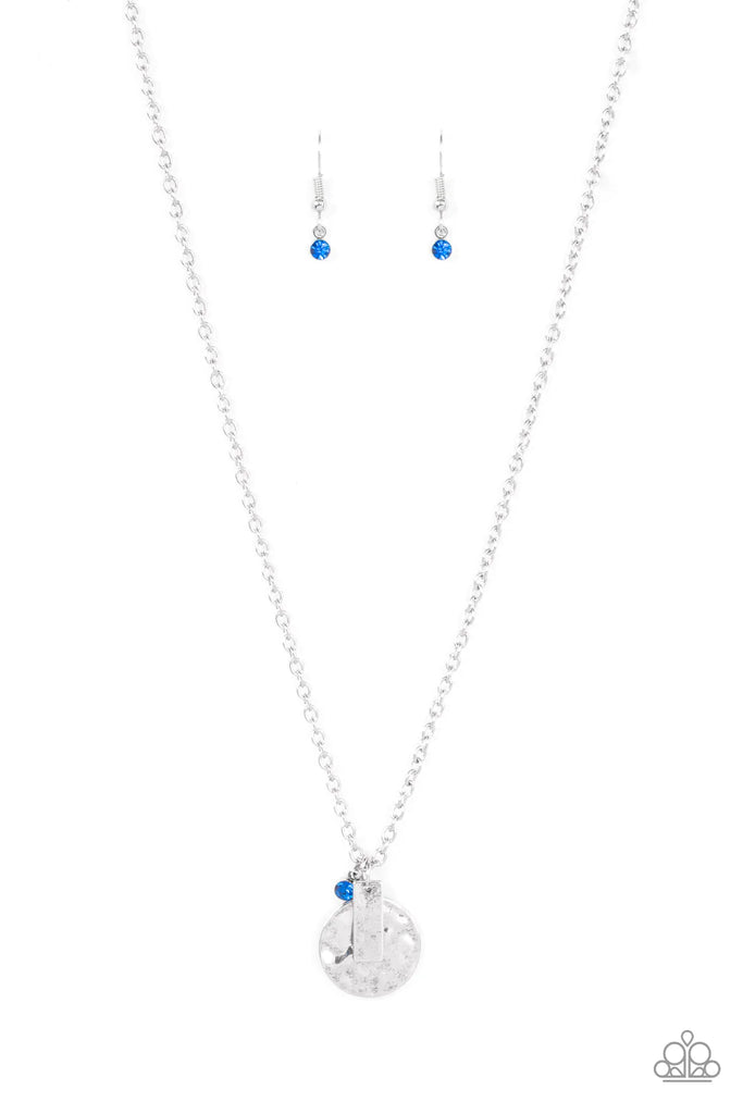 A hammered silver disc, rectangular silver frame, and glittery blue rhinestone swings from the bottom of a dainty silver chain, creating a whimsically layered pendant below the collar. Features an adjustable clasp closure.