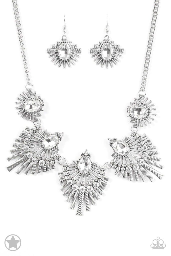 Textured metal bars flare out from a mesmerizing gem, creating a fringe of fanning frames. Sprinkled with matching white rhinestones, the dazzling display falls just below the collar for a sassy finish. Features an adjustable clasp closure.