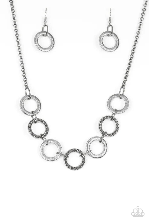 Textured gunmetal hoops and glittery hematite rhinestone encrusted hoops link below the collar for a sassy industrial look. Features an adjustable clasp closure.