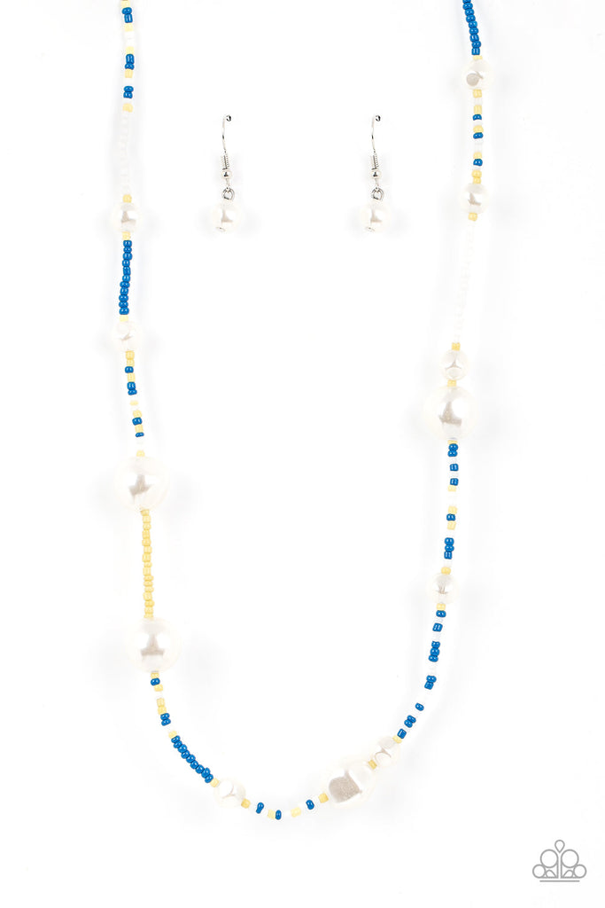 Irregular-shaped pearls in varying sizes are scattered amongst blue, yellow, and white seed beads that are threaded along a wire, resulting in a refreshing and playful style below the collar.