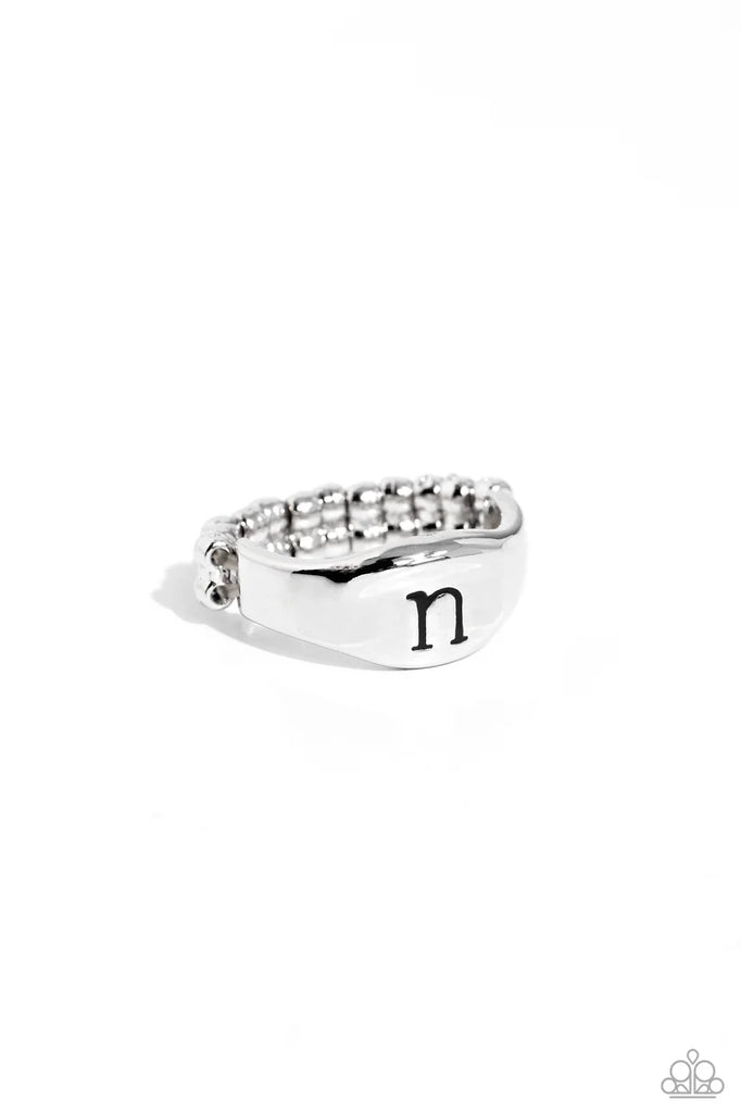 Pressed into the center of a beveled silver band, the black letter "n" stands out for a simple, sentimental centerpiece. Features a stretchy band for a flexible fit.