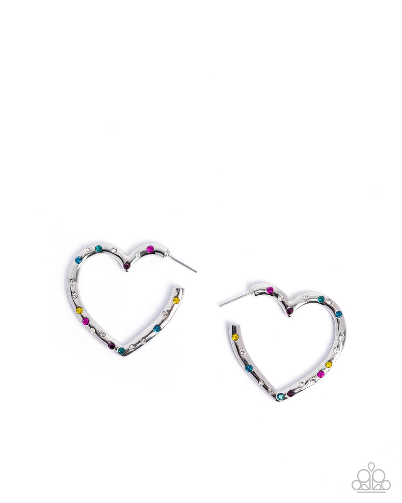 A simple hoop of silver curves around the ear into a heart-shaped frame. Scattered atop the heart frame, dainty multicolored rhinestones dust along the entire front of the frame for a lasting impression. Earring attaches to a standard post fitting. Hoop measures approximately 1 1/2" in diameter.