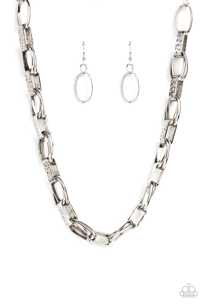 Wide hammered silver links alternate with double sets of shiny silver links as they connect across the collar for an edgy industrial effect. Features an adjustable clasp closure.