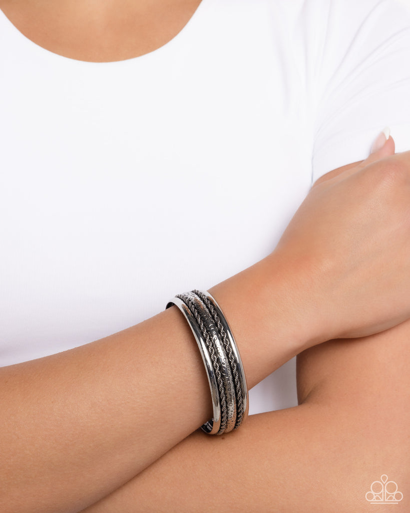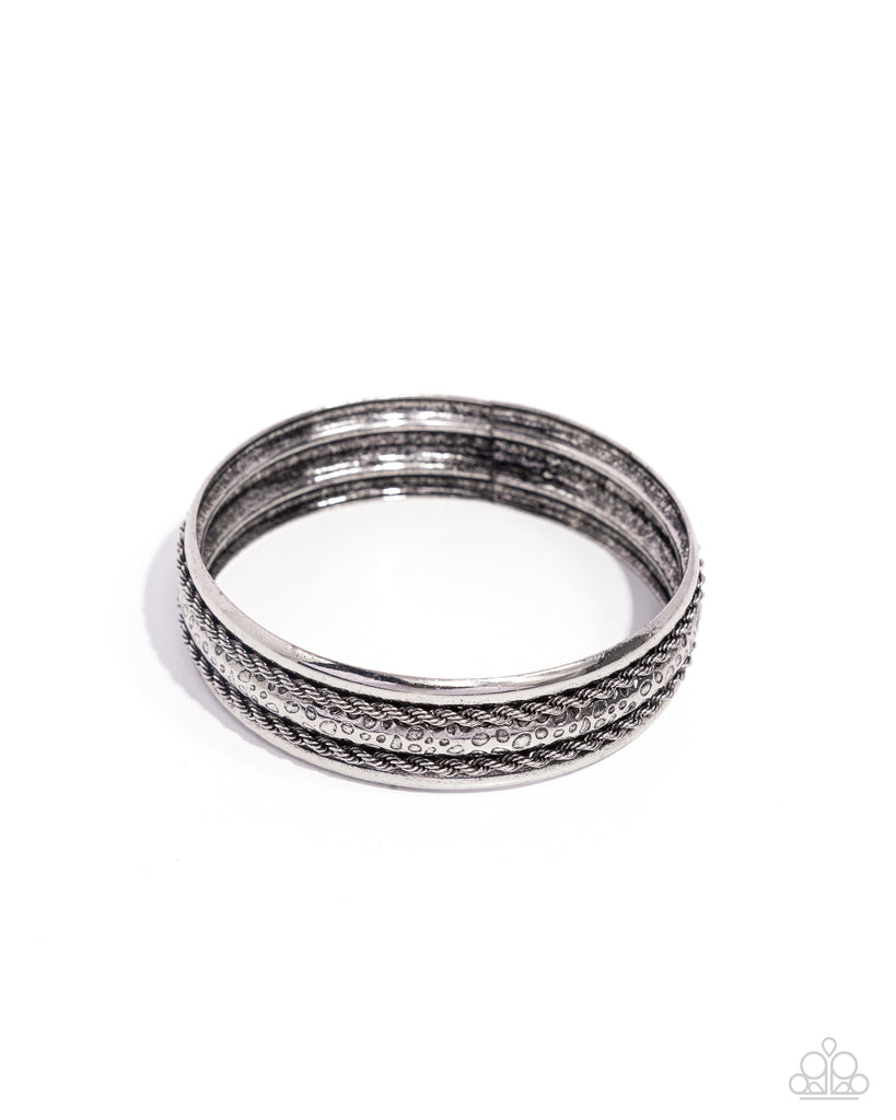 Two rows of twisted silver rope-like cords wrap around a thick silver bangle stamped in a row of antiqued texture for a rustic flair.