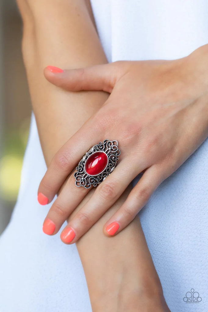 An oval Fire Whirl cat's eye stone is pressed into the center of a backdrop of studded vine-like filigree, creating an enchanting centerpiece atop the finger. Features a stretchy band for a flexible fit.
