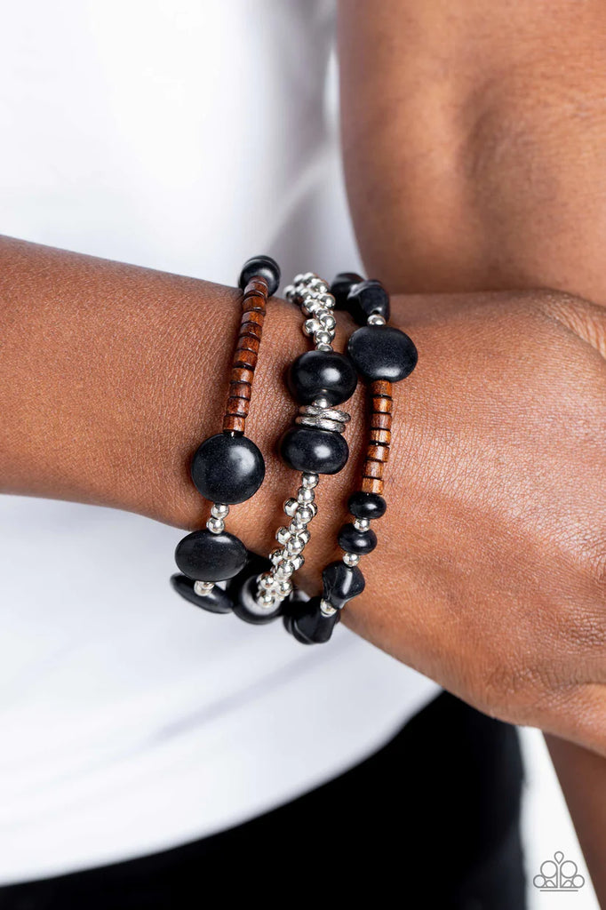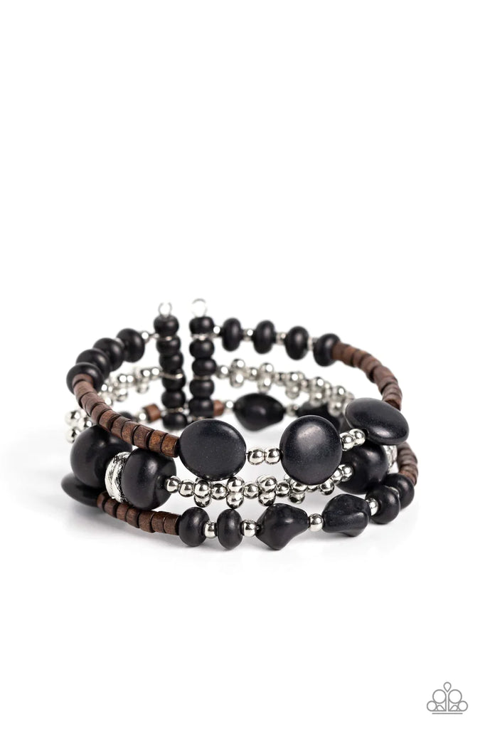 An earthy collection of brown wooden beads, classic silver beads and accents, and black stones in varying sizes are threaded along invisible wires to create three bands that arc across the wrist. The bands attach to silver bars at each end, creating a whimsical illusion of three separate bracelets. As the stone elements in this piece are natural, some color variation is normal.