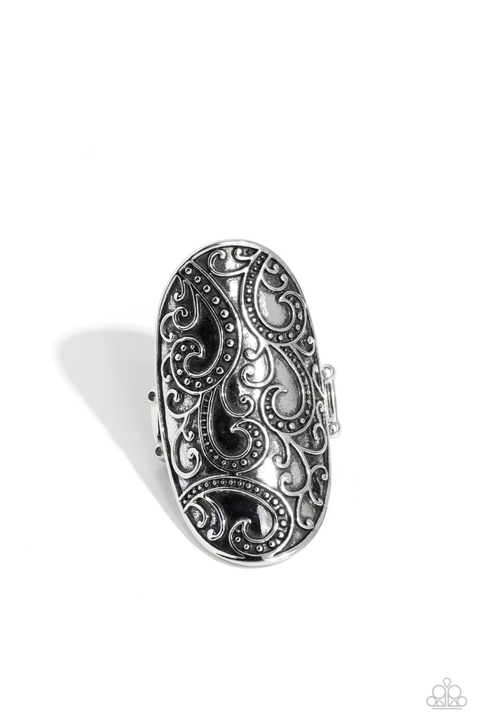 Embossed in a studded paisley pattern, a thick antiqued silver frame folds around the finger for a whimsically vintage look. Features a stretchy band for a flexible fit.