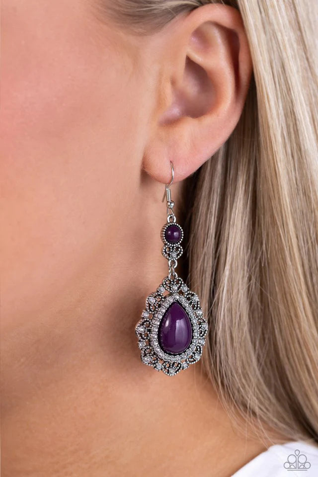 An oversized plum teardrop bead is bordered in a ring of glassy white rhinestones atop a silvery backdrop of a white rhinestone dotted heart motif. The charming frame swings from a matching beaded and rhinestone encrusted fitting, resulting in a romantic dash of color. Earring attaches to a standard fishhook fitting.