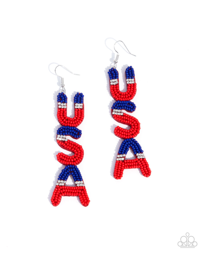 Featuring red and blue seed beads with white rhinestones in dainty square fittings, the red felt letters "USA" cascade below the ear for a polished patriotic lure. Earring attaches to a standard fishhook fitting.