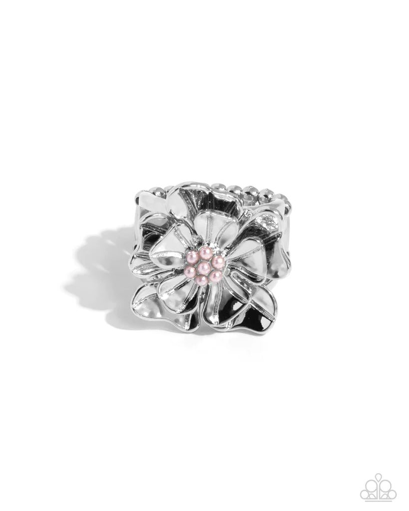 Dotted with dainty baby pink pearls, intricate 3D silver flowers layer into a refined, high-sheen centerpiece atop the finger. Features a stretchy band for a flexible fit.