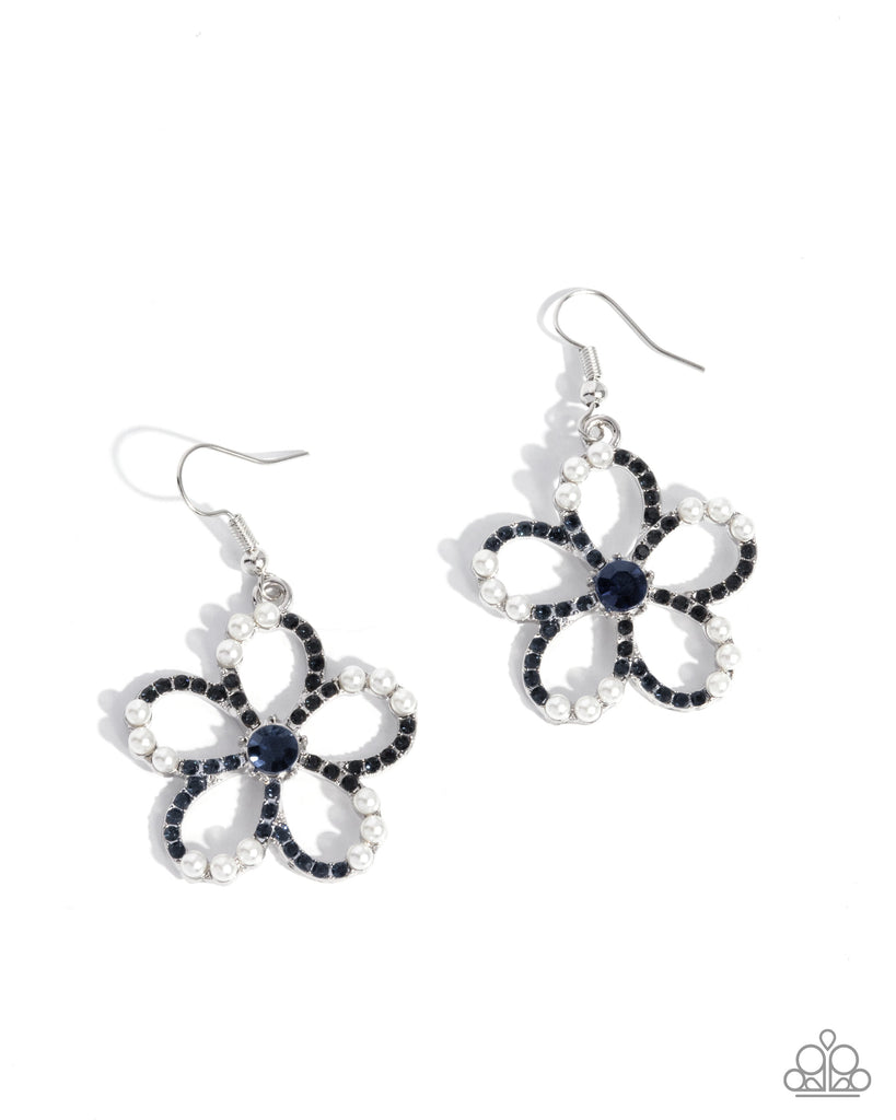 Dazzling Montana rhinestones and dainty white pearls line the petals of an airy flower-shaped frame, creating a whimsical and elegant design. A sparkling Montana rhinestone center adds a touch of brilliance, completing the feminine look. Earring attaches to a standard fishhook fitting.