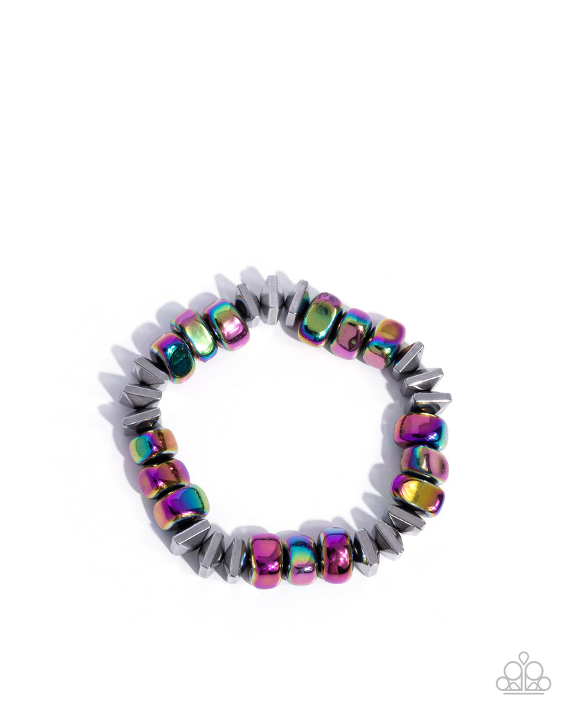 Infused along an elastic stretchy band, a collection of gunmetal square beads that come to a point on both sides pattern along the wrist beside oil spill-brushed chiseled beads for an eye-catching pop of urban color.