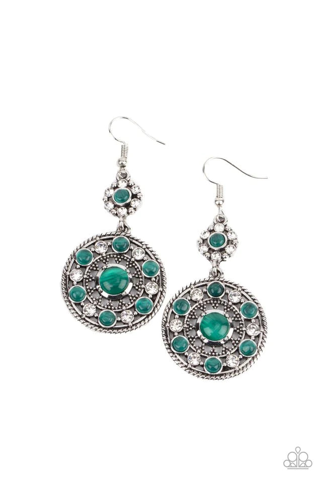 A bubbly collection of Leprechaun cat's eye stones and glassy white rhinestones embellish the front of a studded silver frame. The circular frame swings from the bottom of a matching floral fitting, creating an effervescent fashion. Earring attaches to a standard fishhook fitting.