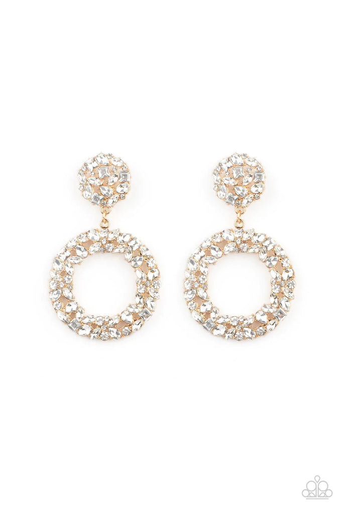 A sparkly wreath of marquise, square, teardrop, and classic white rhinestones delicately swings from the bottom of a matching round golden frame, creating a dramatically dazzling statement piece. Earring attaches to a standard post fitting.
