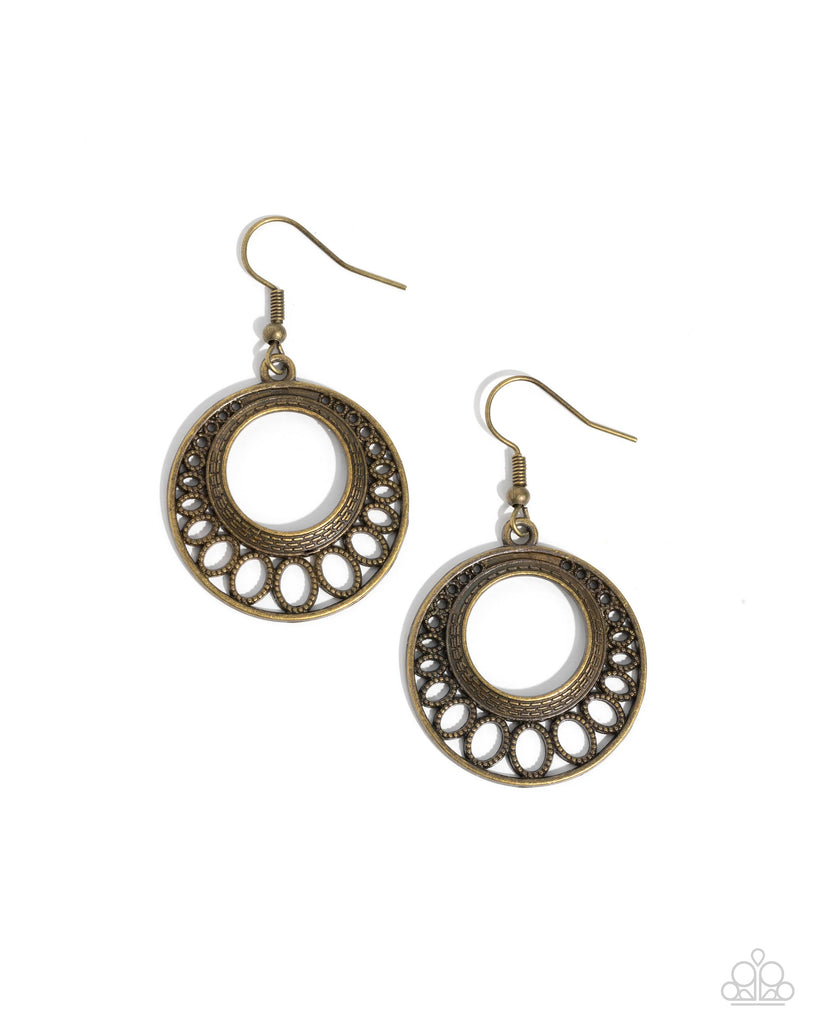 Gradually increasing in size, studded ovals fan out from an airy brass center that delicately connects into a rustic hoop. Earring attaches to a standard fishhook fitting.