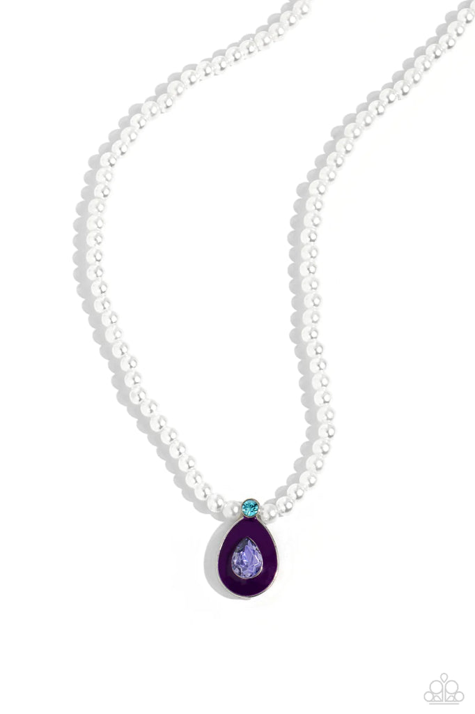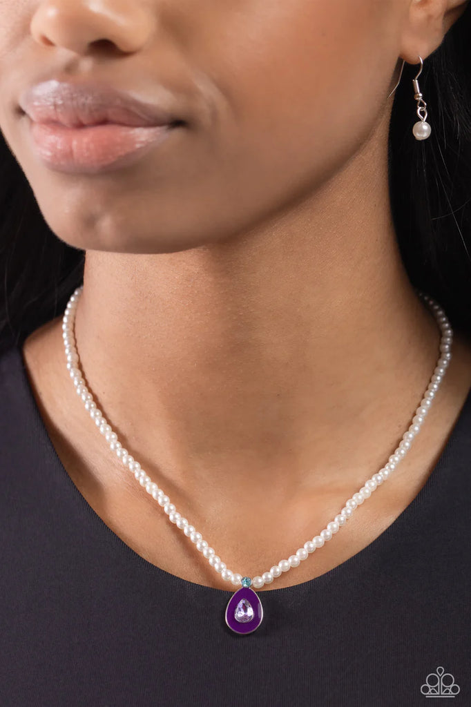Attached to a strand of gleaming dainty white pearls, a teardrop purple gem, bordered by plum paint and an aquamarine rhinestone fitting, swings below the collar for a refined pop of color. Features an adjustable clasp closure.