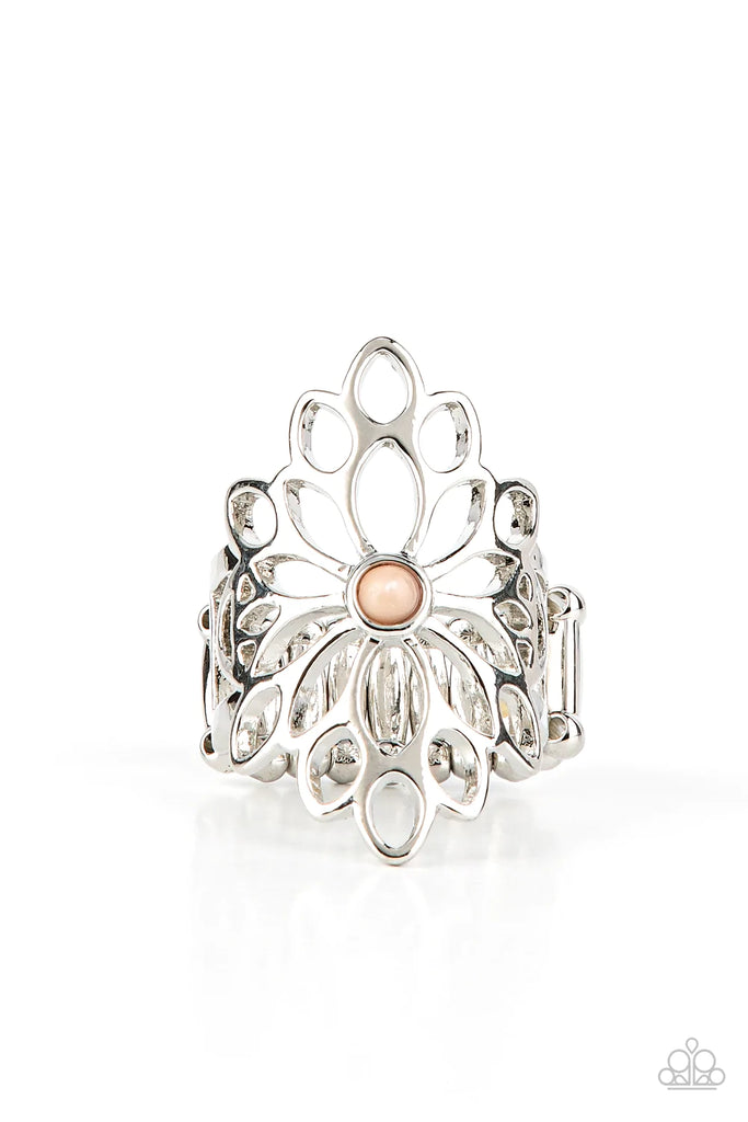 A smattering of airy silver petals blooms from a tranquil tan bead, creating an enchanting floral centerpiece atop the finger. Features a stretchy band for a flexible fit.