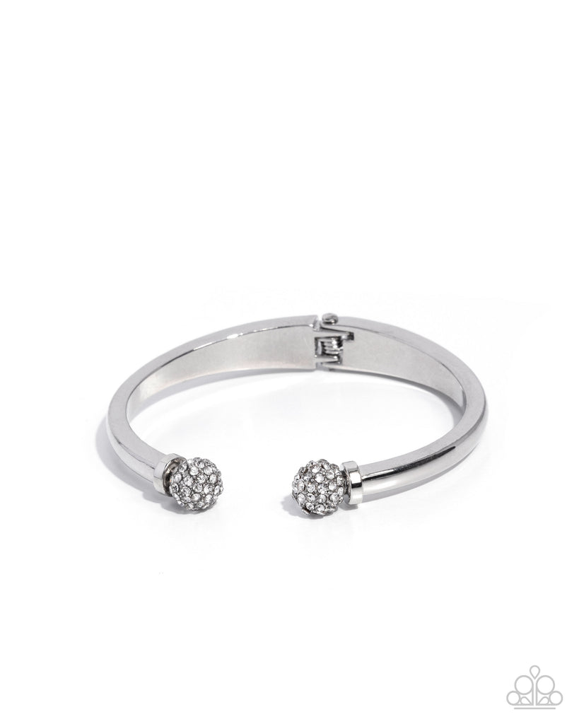 Two glittery spheres encrusted in white rhinestones cap the ends of a sleek silver band, creating a refined pop of shimmer around the wrist. Features a hinged closure.