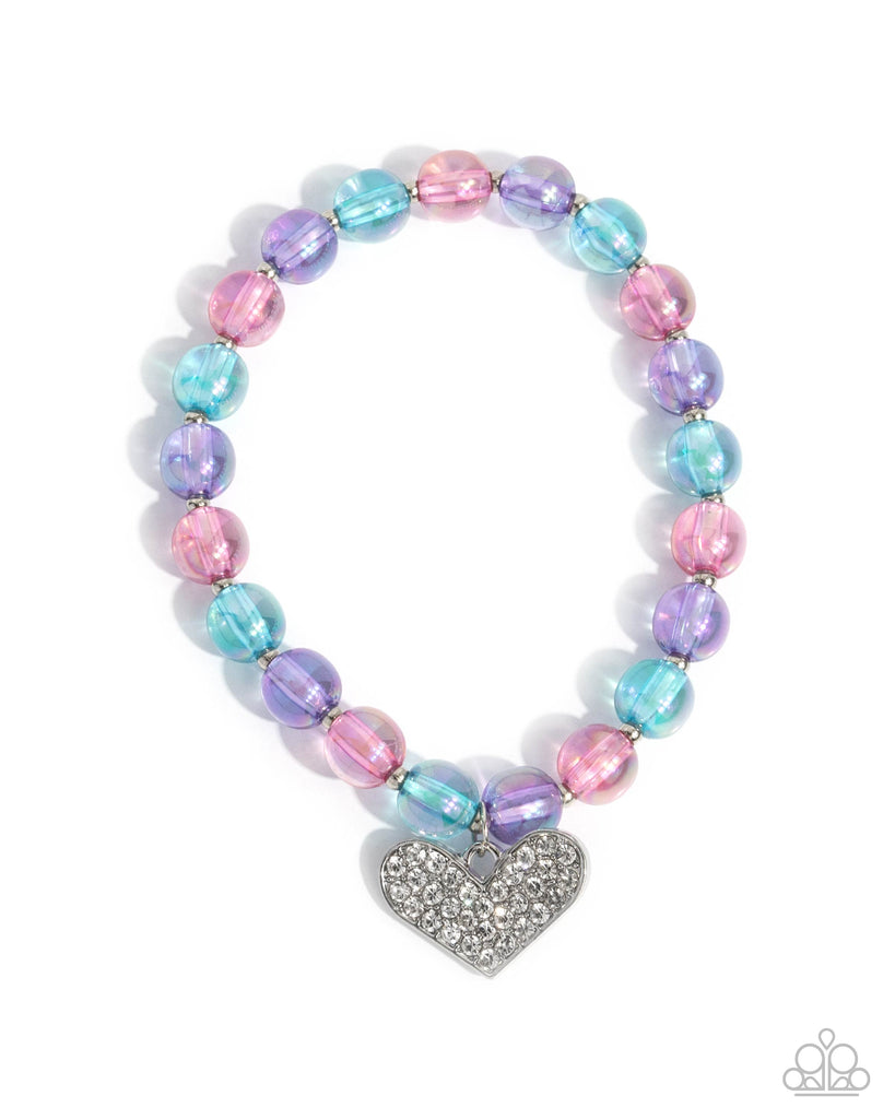 Featuring an iridescent finish, a collection of transparent purple, blue, and Pink Peacock beads are infused along an elastic stretchy band, alternating with silver beads for a colorfully chic pattern. A white rhinestone-dusted silver heart pendant swings from the display for a heartfelt finish.