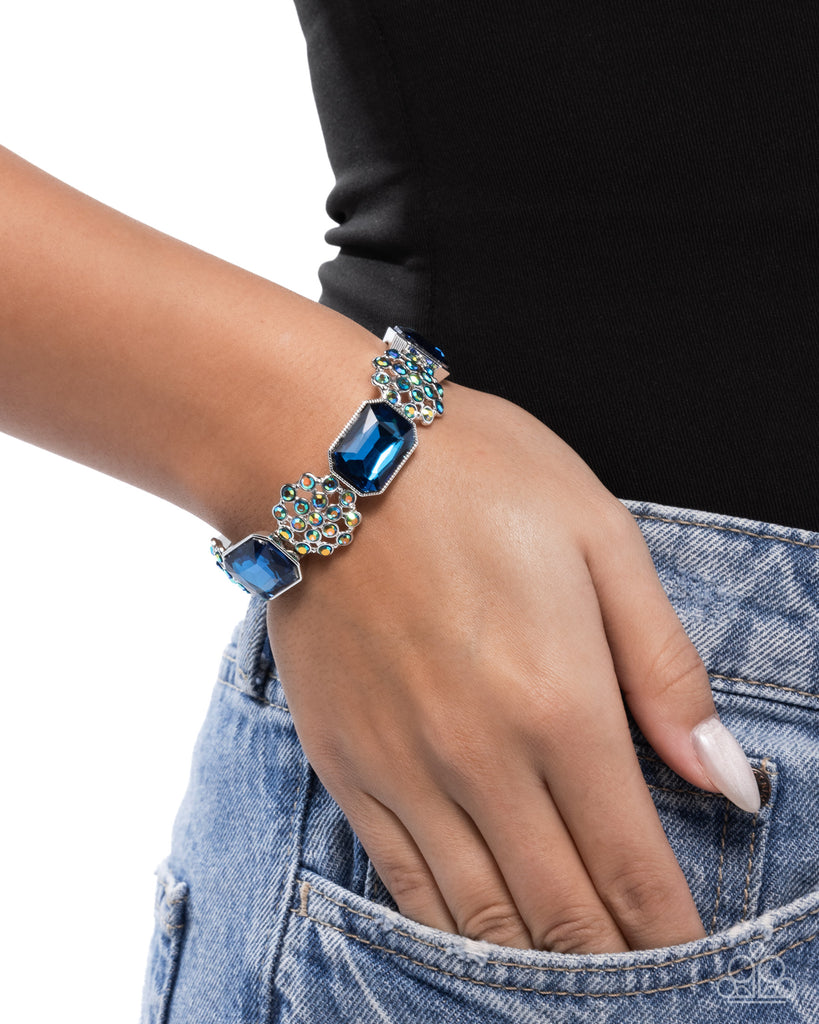 Infused along an elastic stretchy band, a collection of emerald-cut blue gems alternates with blue iridescent rhinestones that dot across airy silver flowers for a whimsical flair of flash atop the wrist. Due to its prismatic palette, color may vary.