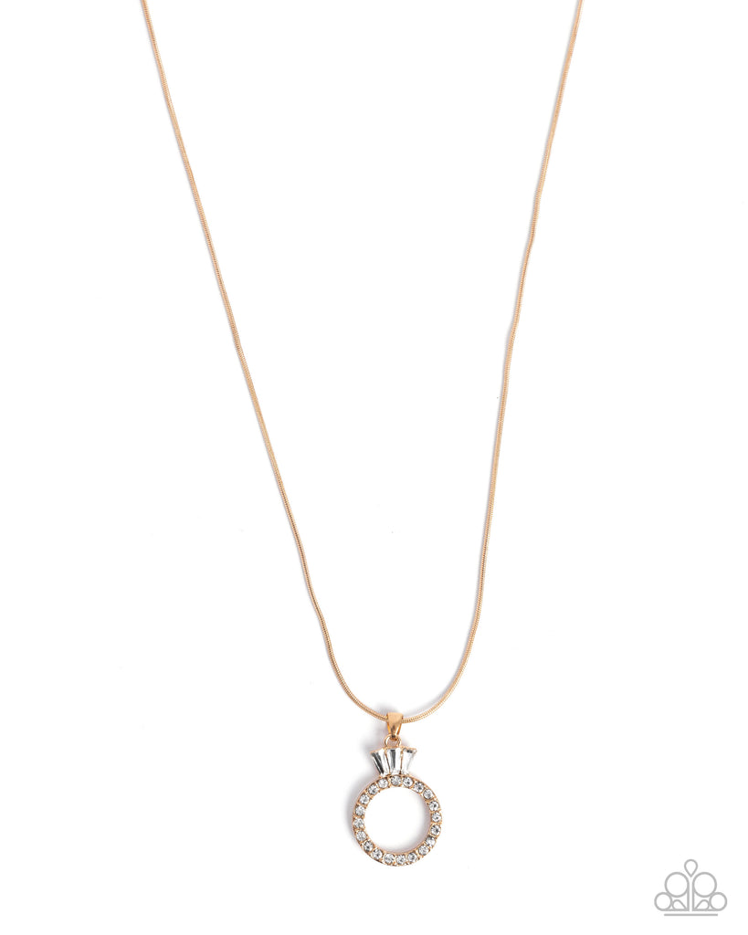 Modeled after a wedding ring, a collection of dainty emerald-cut white gems forms into a princess cut, crowning a gold ring dusted in dainty white rhinestones below the neckline along a gold snake chain for a blissfully blingy statement. Features an adjustable clasp closure.