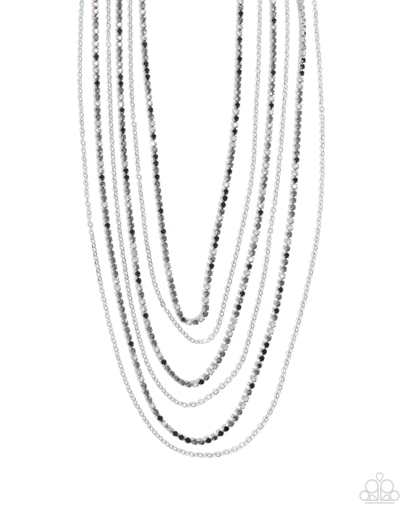 A cascade of shimmering silver chains alternates with rows of faceted black, smoky, iridescent, and hematite rhinestones, creating a bold and dazzling layered effect. The reflective surfaces of the beads enhance the multi-strand design with a touch of brilliance. Features an adjustable clasp closure.
