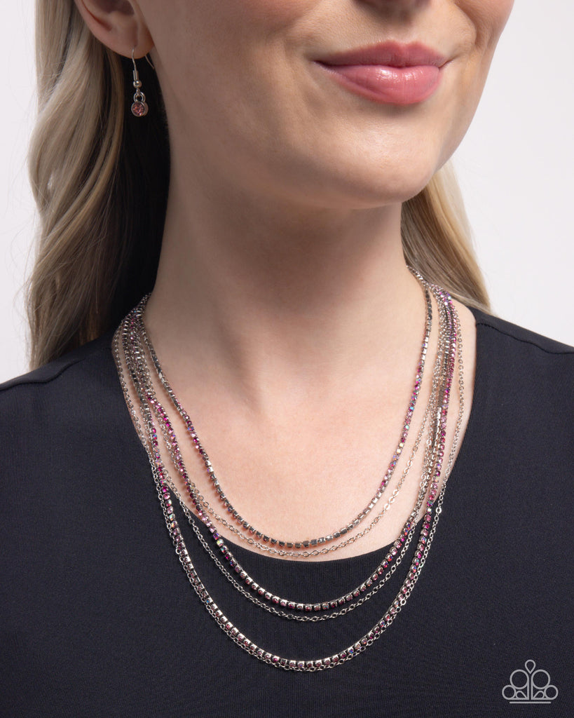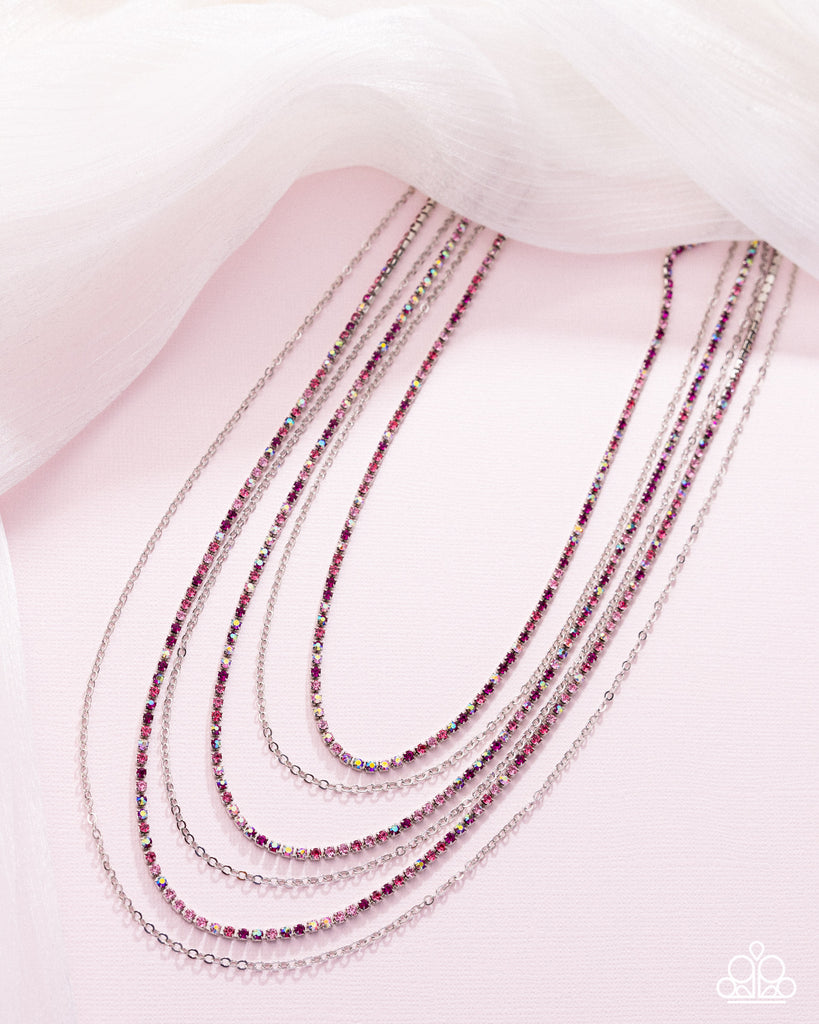 A cascade of shimmering silver chains alternates with rows of faceted fuchsia, light rose, iridescent, and rose rhinestones, creating a bold and dazzling layered effect. The reflective surfaces of the beads enhance the multi-strand design with a touch of brilliance. Features an adjustable clasp closure.