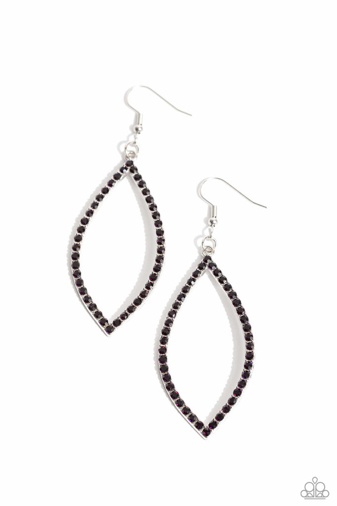 Glassy purple rhinestones encrust the front of a marquise shaped silver frame, resulting in a timeless radiance. Earring attaches to a standard fishhook fitting.