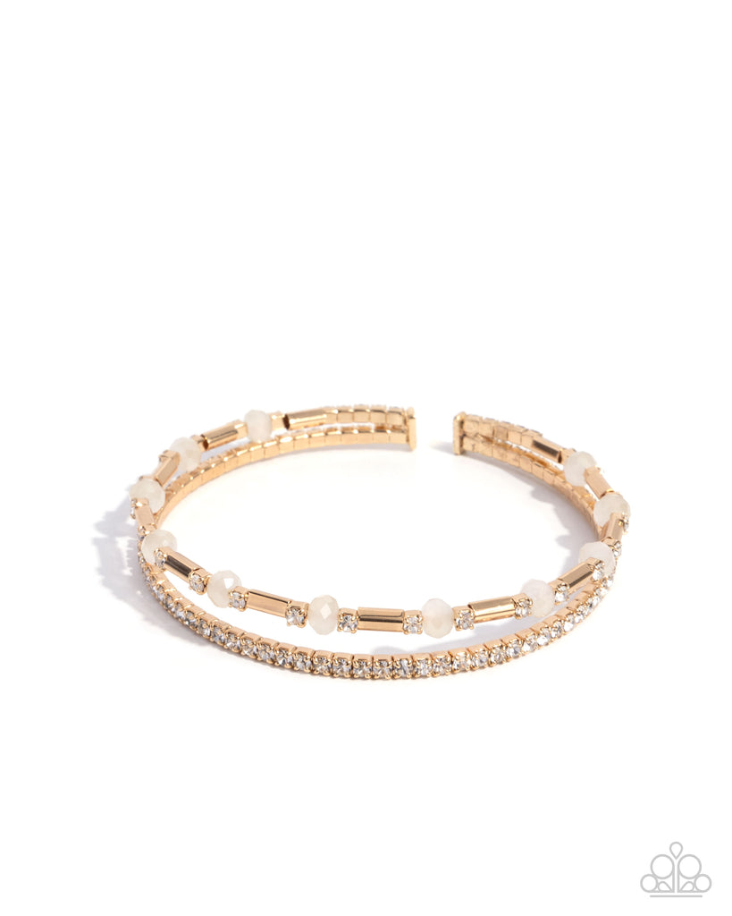 Two rows of sparkling beads are threaded along invisible wires, creating a flexible cuff around the wrist. One row features sparkling white rhinestones, while the other patterns faceted milky white beads with white rhinestones and gold cylindrical beads, creating a sleek and elegant cuff.