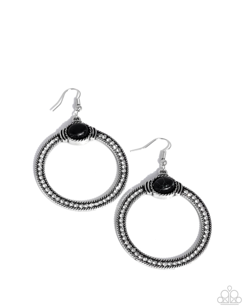 Silver circle frames feature intricate rope-like textures and are accented with a bold black stone at the top. Earring attaches to a standard fishhook fitting.