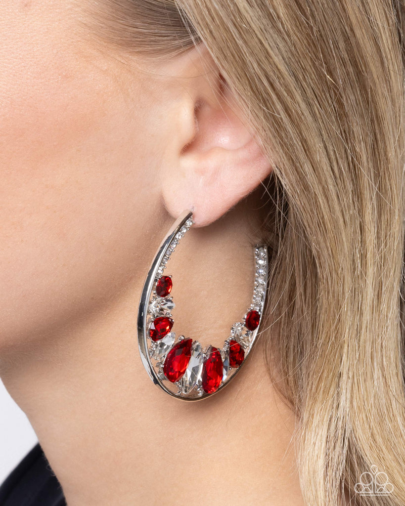The inner surface of a thin silver hoop features a row of white rhinestones in silver square fittings giving way to a collection of brilliantly sparkling white and red round, teardrop, and marquise-cut gems in silver-pronged fittings that gradually increase in size and alternate towards the center of the hoop for a blinding finish. Earring attaches to a standard post fitting. Hoop measures 2 1/2" in diameter.