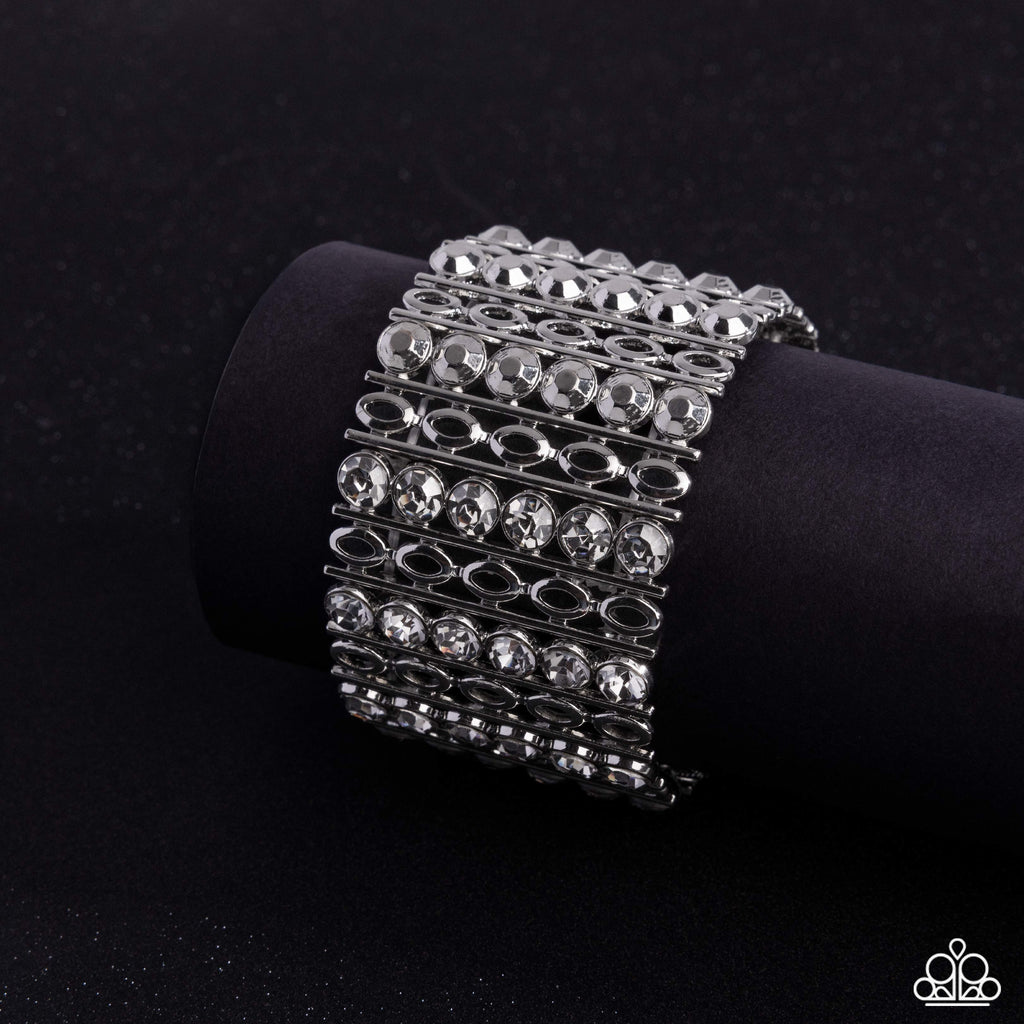 Infused along elastic stretchy bands, row after row of faceted smoky gems, airy silver ovals, and silver elongated bars stack across the wrist for a dramatic look.