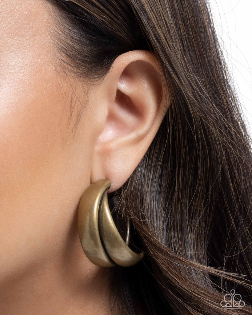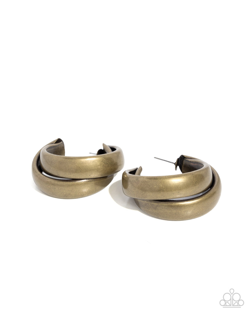 Polished brass hoops are artfully twisted into a bold, layered design, creating a striking statement piece. The sleek and reflective surface enhances the contemporary aesthetic, adding a modern look to any outfit. Earring attaches to a standard post fitting. Hoop measures approximately 1 3/4" in diameter.